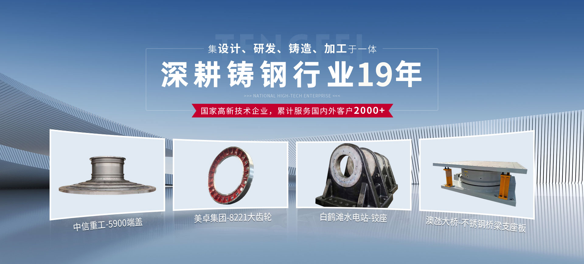 騰飛鑄鋼成立于2006年,位于全國鑄造基地河南省新鄉市,擁有員工300余人,是一家從事150噸以下碳鋼、低合金鋼、不銹鋼鑄鋼件研發、制造、服務為一體的國家高新技術企業。  公司通過了ISO9001國際質量管理體系認證,擁有2項發明專 利,2項河南省科技成果、25項實用新型技術,通過了“環保績效評級B級企業”驗收,先后榮獲“河南省鑄造行業綠色發展企業”、 “河南省科技型中小企業”、“河南省專精特新中小企業”等榮譽稱號。  公司擁有2臺25噸電爐,4臺大型天燃氣熱處理爐、10米回旋自動拋丸機一臺, φ8m數控立車、φ10m數控滾齒機等各類高精裝備100余臺套,年產能3萬余噸,能為客戶提供從產品設計、木模加工、大型鑄造、大型加工一站式服務,產品廣泛應用于建材、冶金、鍛壓、冶金、水工、路橋、化工等多個重型行業。  長期服務于中信重工、中船重工、美卓、上海中交、萊歇、寶武、濟南重工等全球知名企業,在行業內擁有較高的市場知名度和美譽度。